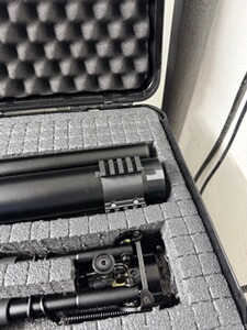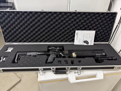 Zubehör: Zielfernrohr Feyachi 4x32 mit farbigen 3fach Absehen in Grün-Rot-Blau Neuware / Zweibein Neuware / Picantiny Bottle Clamp Neuware 3fach am Tank / 1 x Manometer Abdeckung Neuware / Tank und Einfüllstutzen Abdeckung Neuware / 2 x Magazine (1 x Alu und 1 x Kunststoff) sowie ein Einzelschussadapter / Professioneller Alu Waffenkoffer abschließbar mit Zahlenschloß. Bedienungsanleitung und Exportkarten von Go Gun 8,0 und 5,5 sowie die F Karte mit 0.9 dabei.