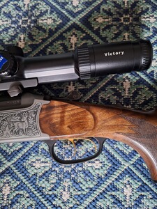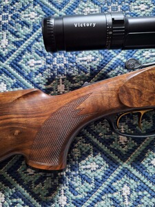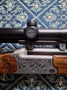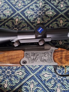Die Blaser BBF Blaser 95 ist eine hochwertige Bockbüchsflinte, die sich besonders für den Jagdsport eignet. Die Schussleistung ist auf 50 Meter mit Kugel und Flintenlaufgeschoss sehr präzise. Ein Zielfernrohr Zeiss Variopoint 3-12 ×56 mit Schiene ist montiert. Die Waffe wurde nur auf dem Schießstand genutzt und ist in einem exzellenten Zustand. Das Schaftholz ist von sehr guter Qualität, und die Waffe ist mit einer ansprechenden Gravur versehen. Bei Fragen 01712195087
