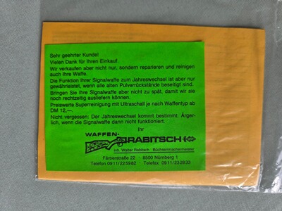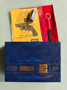 Zum Angebot kommt ein Signalrevolver RG 59 "Le Petit", 5-schüssig, PTB 527. Dieser Revolver wurde nicht geschossen, immer in der Sammlervitrine aufbewahrt und ist ebenso wie Verpackung und Zubehör in hervorragendem Zustand. Er wurde noch vor der Wiedervereinigung von der Firma Röhm hergestellt, wie Sie der 4-stelligen PLZ entnehmen können. In diesem Zustand auf jeden Fall eine Seltenheit! Im Lieferumfang enthalten sind ein Abschussbecher(noch originalverpackt), eine Reinigungsbürste, ein rotes Filztuch, die Gebrauchsanweisung sowie der original blau-goldene Röhm-Karton. Der RG 59 zählt aufgrund seiner Handlichkeit und der soliden, robusten Verarbeitung zu den beliebtesten und zuverlässigsten Signalrevolvern überhaupt.