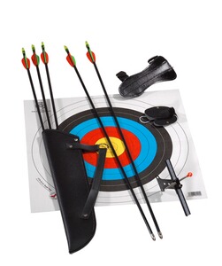 Komplett mit Armschutz, Fingerschutz, Köcher, Visier, Pfeilauflage, Bogenscheibe und 5 Pfeilen.
