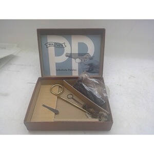 Waffe mit fester Visierung, braunen Plastik Griffschalen, Magazin 1 mit schwarzer Plastik Fingerverlängerung, Signalstift, Fangriemenöse, Original Pappschachtel mit kompl. Zubehör.