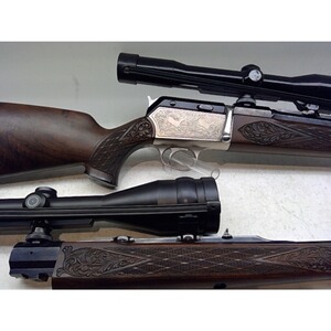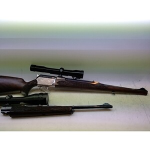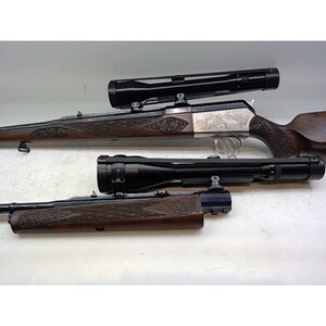 Repetierstutzen Blaser SR830 mit Handspannung in 6,5x57 und Wechsellauf in .308Win mit Magnaport. Lauflänge 6,5x57 ca. 51cm, .308Win ca. 51cm. Gesamtlänge 99cm, Schaftlänge ca. 35,5 cm. ZF Schmidt&Bender 2,5-10x56 Abs. 4 und Zeiss 1,5-6x42 Diavari Z Abs. 4, beide unbeleuchtet auf Schwenkmontage. Schön gemasertes, dunkles Schaftholz. Kleiner Riss im Holz von ca. 2 cm Länge hinter Hahn, siehe Bild.