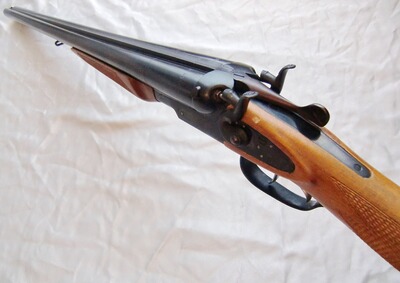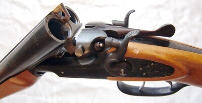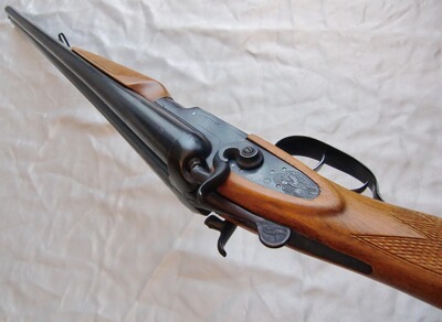 Im Kal. 12/70, robust und solide verarbeitet! Mit Doppelabzug und Rückspringer-Hahnschlossen. Doppelte Laufhakenverriegelung mit Greenerriegel, ohne Ejektoren, mit Hülsenausziehern, Perlkorn.
