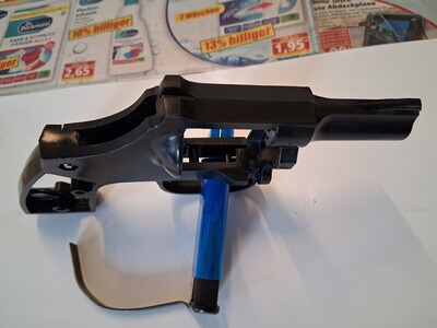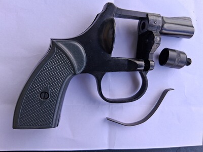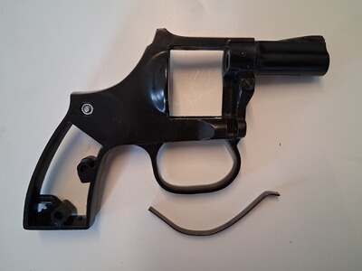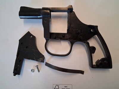 Griffstück mit Griffschalen, Hahnfeder und Abschussbecher für Schreckschuss-Revolver Melcher ME 86 Kal. 6 mm Flob. K. (PTB 205).