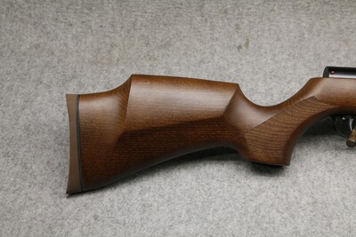 Eleganter Buchenschaft mit beidseitiger Backe, für Rechts- und Linkshänder, Fischhaut am Pistolengriff und am Vorderschaft, Gummischaftkappe. Gesamtlänge 1.120 mm, Gewicht ca. 4,1 kg.