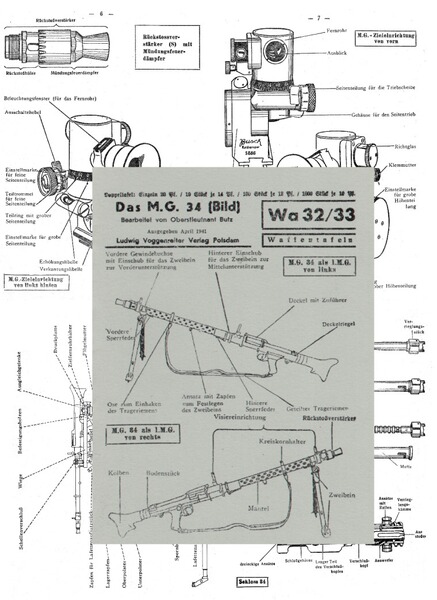 gebundener Nachdruck der Wehrmach Dienstvorschrift D.127/1 „Anleitung für die Bedienung und Verwendung des M.G. 34, Teil 1 als l.M.G.“ von 1936. A6-Format. 102 Seiten mit 60 Abbildungen. Behandelt werden folgende Themen: