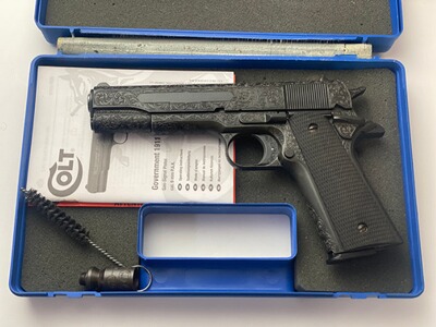 Ich verkaufe eine gravierte Colt Government 1911 von Umarex, die ich komplett von Hand graviert habe, damit ist sie ein Einzelstück.