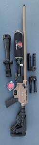 Der Hatsan Factor .22 verfügt über eine Carbon Flasche, die in Kombination mit dem Huma Air Bottle Regulator eine präzise und zuverlässige Anwendung unterstützt. Die Ausstattung wird durch ein Vector Optics 6x24 Zielfernrohr ergänzt, das eine detaillierte Zielerfassung ermöglicht.