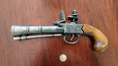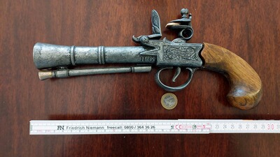 Dekorative Nachbildung einer historischen Vorderlader-Steinschlosspistole im Stil einer Piraten-„Donnerbüchse“ (Blunderbluss/Tromblon). Das Modell ist im Detail gestaltet: mit aufwendig verziertem Metallschloss und Schaft aus Holz. Die Pistole lässt sich nicht abfeuern und dient ausschließlich als Dekorationsobjekt.