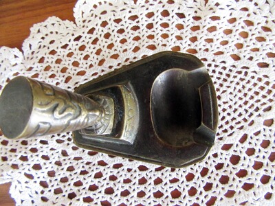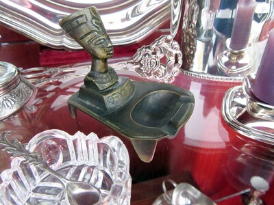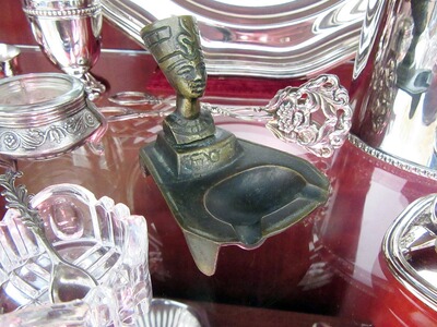 Süßer kleiner Vintage Aschenbecher aus Bronze oder patinierten Messingguss. Auf vier, sich nach unten hin verjüngenden, Füßchen ruhender trapezförmiger Korpus der auf der breiten Seite eine Aschenbecherschale sowie auf der verjüngten Seite eine Sockel aufweist. Auf dem Sockel ruht eine ägyptische, weibliche Büste, wahrscheinlich die der Nofretete. Das reizende Stück weist dem Alter entsprechende Gebauchsspuren auf. Die Schraube zur Halterung der Nofretete wurde mal ersetzt. Ein Hersteller kann leider nicht benannt werden.