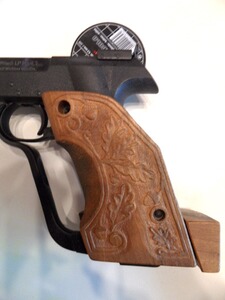 Nr. 4 - Walther LP Mod. 3, Nr. 40221, F im Fünfeck, ab 18 Jahre frei, Holz-Matchgriff mit wunderschönen geschnitzten Eichenlaub- und Eicheln-Motiven, Druck, die Waffe wurde überholt, Gewicht ca. 1.322 g, Länge ca. 32,5 cm.