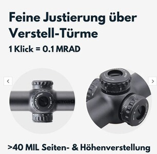 Zu den bemerkenswertesten Eigenschaften dieses Zielfernrohrs gehören das beleuchtete Absehen mit 6 Stufen welches der Umgebungshelligkeit angepasst werden kann um das Ziel schnell zu erfassen und die feine Verstellung in 1/10MIL Schritten. Dies ermöglicht eine bessere Sichtbarkeit des Absehens bei schlechten Lichtverhältnissen oder in der Dämmerung und eine feine Anpassung der Zielgenauigkeit um das Zielfernrohr optimal in Ihre individuellen Bedürfnisse und Schießbedingungen anzupassen.