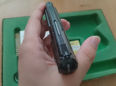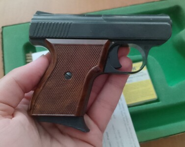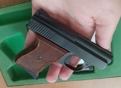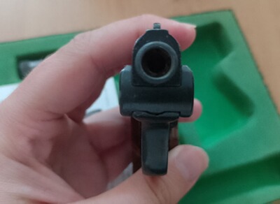 Die Pistole wurde zum Test geschossen und funktioniert. Sie wird mit einer schönen Schachtel verkauft, dabei ist noch die Gebrauchsanweisung mit Becher und Bürste. Dazu noch eine Schachtel CS-Gaspatronen