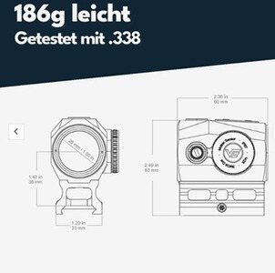 Dieses Modell zeichnet sich insbesondere durch den nur 3MOA großen Dot, die äusserst kompakte Bauweise und das geringe Gewicht aus. Ausserdem hat es absolute co-witness (36mm) und verfügt über einen Motion Sensor (automatische Abschaltung nach 2 Min. wenn keine Bewegung erfasst wird, schaltet sich umgehend wieder an sobald es sich bewegt) um die Batterie zu schonen.