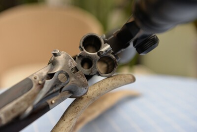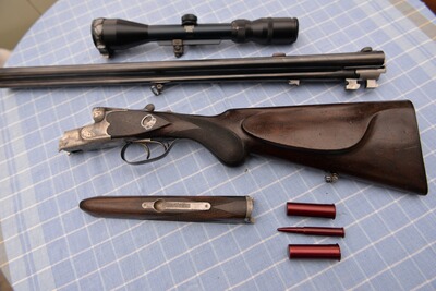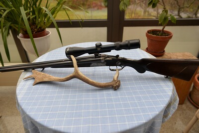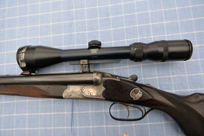 Lauflänge: 60 cm, Schaftlänge bis zum vorderen Abzug: 36 cm, Gesamtlänge: 102 cm, Stahlbasküle mit leichter Gravur, Suhler Einhakmontage. Zielfernrohr. Linsenfeld 3-9 x 42, Absehen 1, in sehr gutem Zustand.Die Waffe wurde vom Büchsenmacher sorgfältig restauriert und befindet sich entsprechend ihres Alters in einem guten Zustand.
