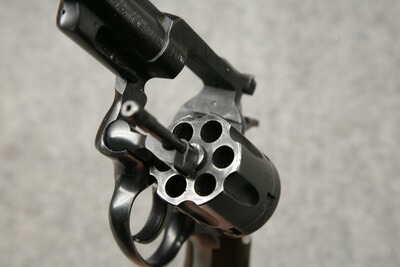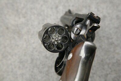 Kaliber .357 Magnum. Lauflänge 4" (102 mm). Unverwüstlicher Ganzstahl-Revolver, brüniert, Mikrometer-Visierung mit Rampenkorn, Nussbaumgriffschalen.