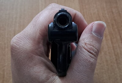 Die Laufsperre liegt tief im Laufinneren und ist so nur leicht zu sehen (fast scharfe Optik). Mir bekannte Stahlteile sind der Schlagbolzen, das Abzugsgestänge und der Innenlauf mit Sperre. Ich habe sie zum Test geschossen und sie funktioniert. Ich habe sie nicht weiter auseinandergenommen oder im Inneren untersucht, nur noch geölt. Die rechte Griffschale ist leider eingerissen, hält aber noch, siehe auch Bild, die Brünierung wurde an manchen Stellen vom Vorbesitzer nachlackiert, weitere Sachen sind mir nicht bekannt.