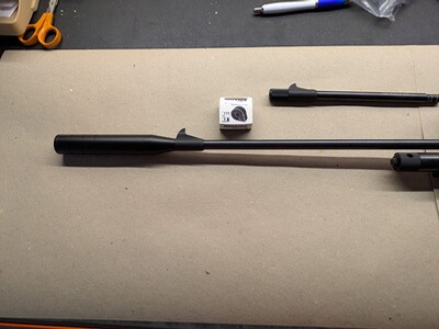 Zum Set gehören das 9 Schuss Magazin, Zielfernrohr, Schalldämpfer sowie der kurze Lauf für den Umbau zur Pistole.