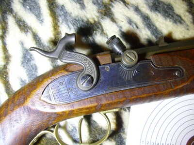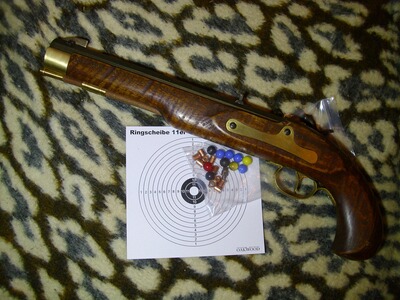 Zum Verkauf steht eine Perkussionspistole Kentucky von Jukar, Kal.45 mit gezogenen Lauf, mit Beschuss, mit indoor Piston zum zu hause schießen. Ein Westernspaß für die ganze Familie. Lauf , Zündkanal und Piston sind frei. Der Hahn rastet 2 mal ein und schlägt ab. Voll funktions- und schussfähig. Dazu gehört der Ladestock, 10 Zünder 209, 10 Plastekugeln eine Zielscheibe und das Originalpiston für den scharfen Schuss auf den Schießplatz, wenn die Berechtigug vorliegt.