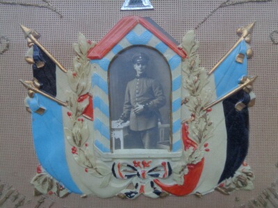 In der Mitte befindet sich ein plastisches Ornament mit dem schwarz-weiß Foto eines unbekannten Soldaten.