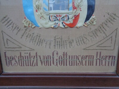 Der Text der Bestickung lautet sinngemäß: „Das Vaterland hat gerufen, wir folgten der Fahne gern, unser Feldherr führte uns siegreich, beschützt von Gott unserem Herrn“.