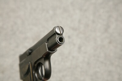 Kaliber 6,35 mm Browning. Modell 2, Lauf 79 mm, Gesamtlänge 145 mm, Gewicht ca. 505 g. Magazin für 7 Patronen. Verschlußfeder über dem Lauf.