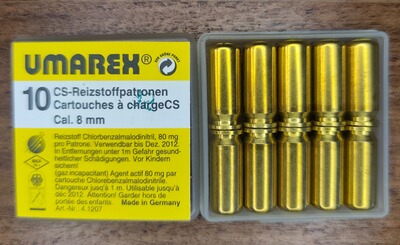 Zum Verkauf stehen 10 CS Gas Patronen im Kaliber 8mm Schreckschuss Munition. Jede Patrone enthält 80 mg Ortho-Chlorbenzalmalondinitril, was eine sehr starke Ladung darstellt. Aufgrund des MHDs von 2012 sind diese Patronen besonders stark geladen.