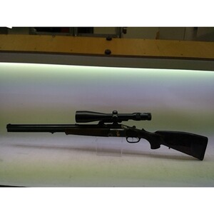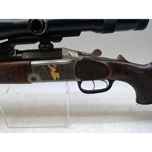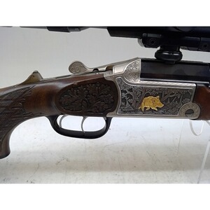 Waffe mit Klappkimme Schrot/Kugel, aufgesetzten Seitenplatten, Rechts Schwarzwild in Gold, Links Rotwild in Gold, Eichenlaub Verschneidung im Holz, Pistolengriff Käppchen mit Rehwild, Pistolengriffschaft mit Schweinsrücken und bayrischer Backe Schaftmagazin (Kugel 2x Groß, 2x Klein) ventilierte Gummi Schaftkappe.