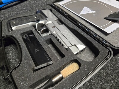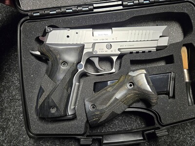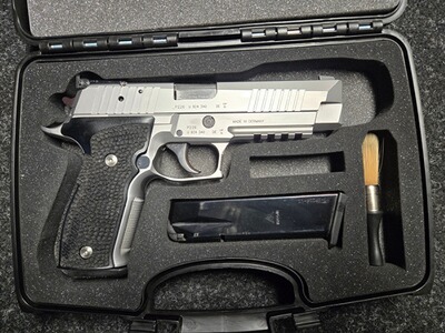 Sie haben hier die Möglichkeit, die begehrte und nicht mehr zu bekommene SIG-Sauer 226 X-Five zu einem vernünftigen Preis zu erwerben. Zur Waffe muss nicht viel gesagt werden, sie ist eine Legende und man ist sich einig, dass die SIGs aus US-Produktion nicht an die Qualität Made in Germany heranreicht! Zur Präzision gibt schon die Werksanschussscheibe einen Vorgeschmack. Die Waffe ist in einem sehr guten Zustand. Es handelt sich um die letzte Evolution der Nachfolgerin der legendären SIG 210 bzw. m49, welche als Pistole 75 in die schweizer Armee eingeführt wurde. Die Waffe besteht natürlich aus bestem Edelstahl. Es sind zwei Paar Griffschalen dabei, die originalen aus Hold habe ich für die Abbildung einmal nur aufgelegt, montiert sind sehr praxistaugliche und extrem griffige Kunststoffgriffschalen mit "Stippling".