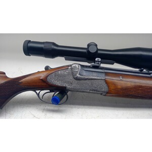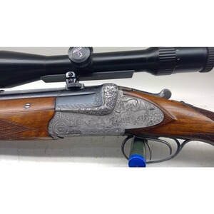 gebr. BBF Krieghoff 16/70, 7x65R mit Austauschlauf BDF 16/70brüniert, 60cm Lauf, offene Visierung, französischer Stecher, Schiebesicherung, ZF Docter 2,5-10x48 mit Leuchtabsehen Punkt (Nacht), Suhler-Einhakmontage, Austauschlauf 16/70 72cm, gravierte Seitenplatten links Rehwild/Hase, rechts Jagdhunde/Fasan, Basküle unten Ente, Nussbaumschaft mit Schweinsrücken und deutscher Backe, Schaftlänge incl. Gummischaftkappe 37cm, Riemenbügel