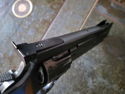 Der Revolver wurde geschossen, das sieht man. Er hat einen Stoß auf die rechte Kornschutzbacke bekommen und hat auch so einige Kratzer. Es wurden aber sehr leichte Laborierungen (H&N High Speed) genutzt, es lassen sich daher kaum echte Verschleißspuren (siehe Bilder, etwa Magnumrille, Ausbrennungen im Trommelspalt etc.) finden. Der Revolver befindet sich in einem guten Zustand und ermöglicht einen vergleichsweise preisgünstigen Einstieg in die spezialisierte Welt dieser Disziplinen. Die Gebrauchsspuren verleihen dem Revolver einen Charme, den so keine neue Waffe bieten kann.