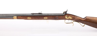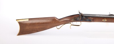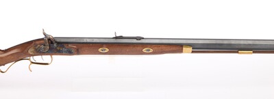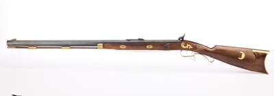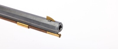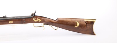 Ein Neoklassiker und die wohl am meisten kopierte Vorderladerwaffe des amerikanischen Büchsenmachers S. Hawken als Scheibengewehr mit Wettkampfcharakter. Doppelte Laufhaltekeilen für eine präzise Lauflage, Buckhorn-Visierung, Stecher, buntgehärtetes System und Schloss, sowie einem Walnussschaft mit Messingbeschlägen. Gesamtlänge 113 cm, Gewicht 4,4 kg.