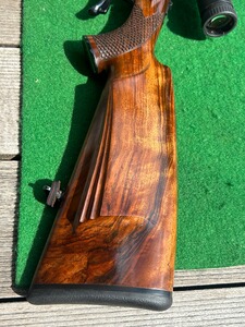 - Luxusschaftholz mit Schuppenfischhaut, Doppelfalzbacke und Kaisergriff, Pistolengriffkäppchen ist in schwarz eingefasstes Edelholz