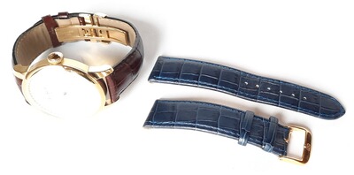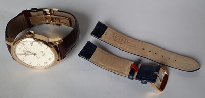 Der Lieferumfang umfasst - neben der Uhr - selbstverständlich die zugehörigen Dokumente, die Uhrenbox sowie ein hochwertiges, zweites Lederarmband in Blau.