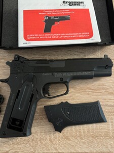 Biete hier eine Crosman C40 im neuwertigen Zustand zum Verkauf an. Die Pistole wirkt wie eine echte und bringt ein Gewicht von über 1200 Gramm leer auf die Waage. Sie lässt sich sehr gut schießen und das Treffer Bild ist auch sehr gut.