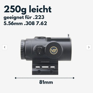 Das SCPS-M04 mit 4x Vergrößerung bietet zudem eine Möglichkeit ein Reddot mit MAG Footprint (RMSc kompatibel) auf der Oberseite zu montieren für den schnellen Wechsel zwischen 1x und 4x Vergrößerung. Kompatible Reddots dazu finden Sie am Ende der Beschreibung.