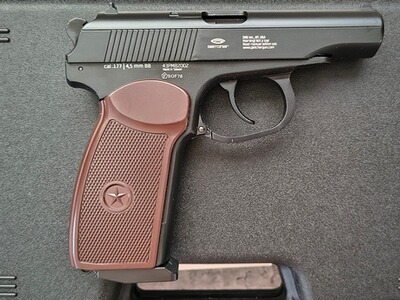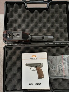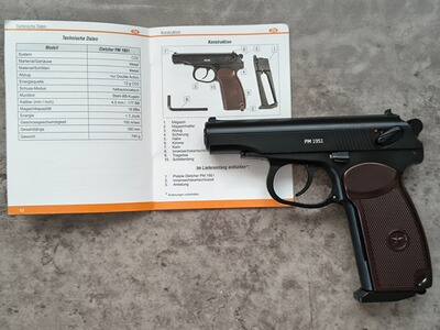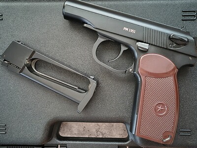Gletcher PM 1951, detailgetreuer Nachbau der russischen Militärpistole MAKAROV, in unbenutztem (nicht geschossenem) Zustand. Vollmetall, Blow-Back, Kunststoffgriffschalen. Absolut neuwertig und ohne Gebrauchsspuren, Lieferumfang mit Waffenkoffer, Innensechskantschlüssel und Anleitung.