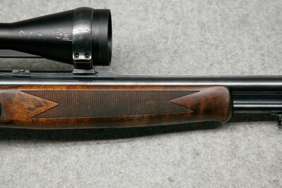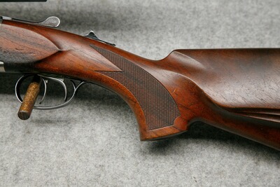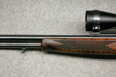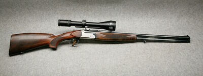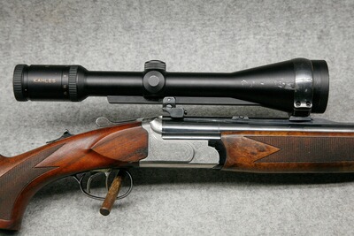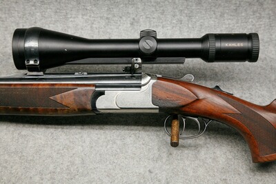 Kaliber 12/70 - .30-06 Spr. Lauflänge 65 cm. Handspannung. Stahlbasküle, massive Keilverriegelung für lange Haltbarkeit und sichere Präzision. Rückstecher für den Kugellauf im vorderen Abzug, Riemebügel. Nußbaumschaft mit leichtem Schweinsrücken und bayerischer Backe mit Doppelfalz. Montiert mit Zielfernrohr Kahles Helia CB 3-12x56, Leuchtabsehen 4, Schiene auf EAW Hebel-Schwenkmontage.