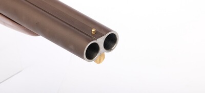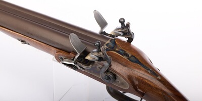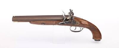 Kaliber 20, glatte Läufe. Großkalibrige doppelläufige Vorederlader-Pistole im klassisch englischen Stil, edler Nussbaumgriff mit Fischhaut, bräunierten Läufen und buntgehärteten Steinschlossen.