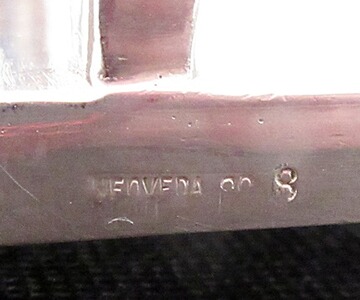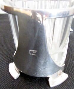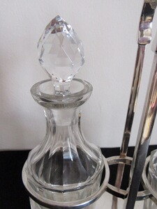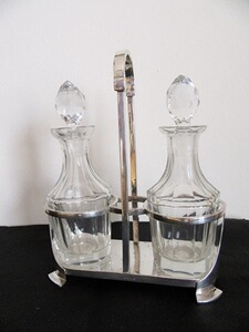 Die beiden, in der Höhe leicht unterschiedlichen, zierlichen Karaffen sind im Viktorianischen Stil gehalten. Die beiden original Bouchons, im Kristallschliff gehaltenen, weisen einen unterschiedlichen Durchmesser, passend je für Essig- und Öl-Karaffe, auf. Einer der Bouchons hat einen Chip (siehe Fotos). Die Stellage besticht durch seine klare Linienführung und Form. Der an den Jugendstil erinnernde Handhaben endet in einem Halbkreis. Der Korpus ruht, ganz im Stil des Art Nouveau, auf 4 achtelkreisförmigen Füßen und weist auf der Seite den Schriftzug „Neoveda 80 oder 90 S“ auf. Die Korpusplatte hat dem Alter entsprechende Gebrauchsspuren, an einer der beiden Wandung befindet sich die Punze „CE“ (siehe Fotos).