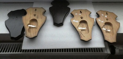 5 dunkele gleichfarbige bzw. gleiche Rehbock Gehörnbrettchen mit Gebißklammern