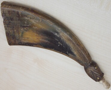 Details aus der Beschreibung des Erblassers: Flachgepreßte Kuhhorn-Pulverflasche für Radschloßgewehre mit Fischmaul und weißem Bein-Verschlußzapfen mit Bohrung; eingepaßter Holzboden nachträglich abgedichtet zum Gebrauch.