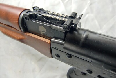 Die Waffe ist schwarz brüniert, Schäftung aus Holz, Griff aus Kunststoff. Hartverchromter Lauf, höhen- und seitenverstellbare Schiebevisierung bis 800m, Sicherungshebel re. am System, Abgeschrägter AK-Mündungsaufsatz – abschraubbar (Mündungsgewinde), Putzstock, Riemenbügel. Sehr praktisch und nicht bei jeder AK selbstverständlich: Seitliche ZF-Montageschiene ist bereits on Board. Somit steht einer klassischen AK-ZF-Montage nichts im Wege.