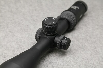 Mit Leuchtabsehen MRAD 1 RD, in der ersten Bildebene (First Focal Plane, SFP). Freiliegende, feststellbare Seiteneinstellung mit Abdeckung, die auf Null zurücksetzbar sind.