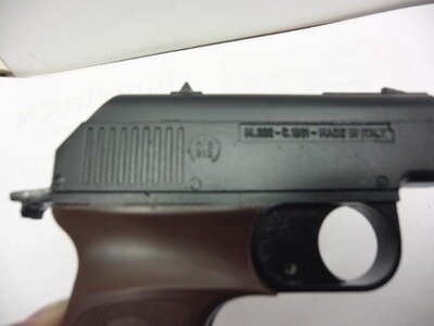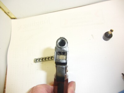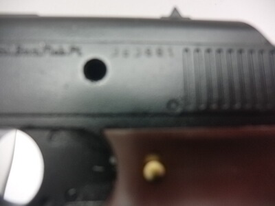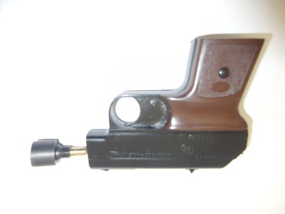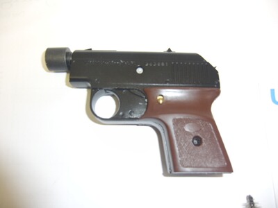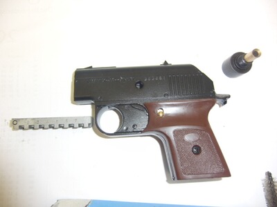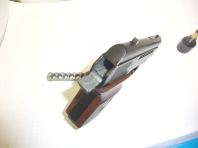 Ausführung: Druckguss lackiert - braune Plastikgriffschalen - am Griffboden lässt sich ein Dorn ausschwenken, mit dem man die Patronen aus dem Magazin stoßen kann.