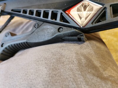 An der Unterseite der Armbrust ist ein Teil der Kunststoff-Picatinny-Schiene abgebrochen. Dies hat keinerlei Einfluss auf die Schussfunktion oder die Sicherheit! Die Schiene dient lediglich der Aufnahme des Frontgriffs. Da die Schiene fest im Gehäuse integriert ist, betrifft die Beschädigung nur die Optik bzw. die Montageposition des Griffs.