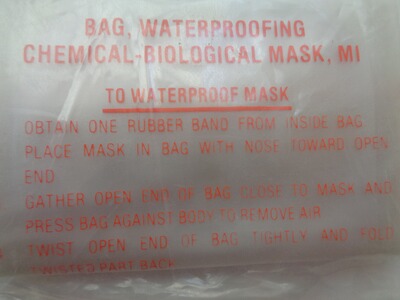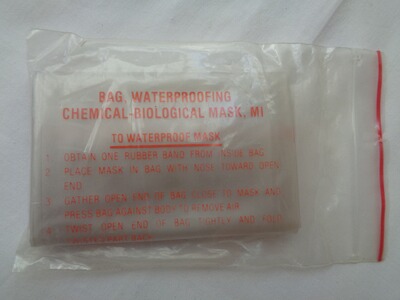 Der M1 Gasmaskenbeutel in dieser Version wurde zu der M17 ABC-Maskenserie (M17, M17A1, M17A2) von Ende der 60ern bis Ende der 80er Jahre ausgegeben und war Bestandteil der Maskentasche. Zum Verschließen des Beutels liegen Gummibänder bei.