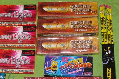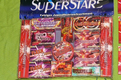 Dazu eine Packung Keller Superstars mit Knallerbsen, Wunderkerzen, Feuerringe, Pyrowirbel, Leuchttaler, Powerballs, Gruselfeuer usw.