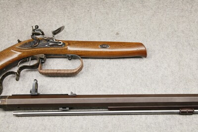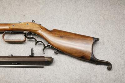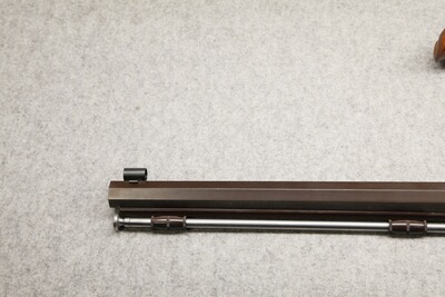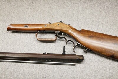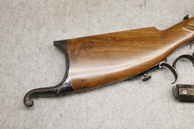 Kaliber .45. Exzellente Reproduktion der Schweizer Scheibenbüchse. Speziell für die internationale Disziplin „Pennsylvania“. Bräunierter Achtkantlauf, Metallteile mit Bunthärtung, Stecher, Nussbaumschaft.