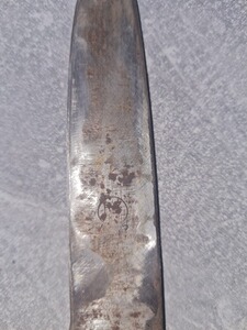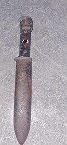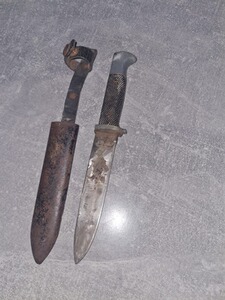 Fahrtenmesser der HJ. Die Klinge wurde öfters unsachgemäß angeschliffen, das Logo RZM ist noch leicht zu erkennen. Der Griff hat einen kleinen Riss. Scheide und Lederriemen sind vorhanden.